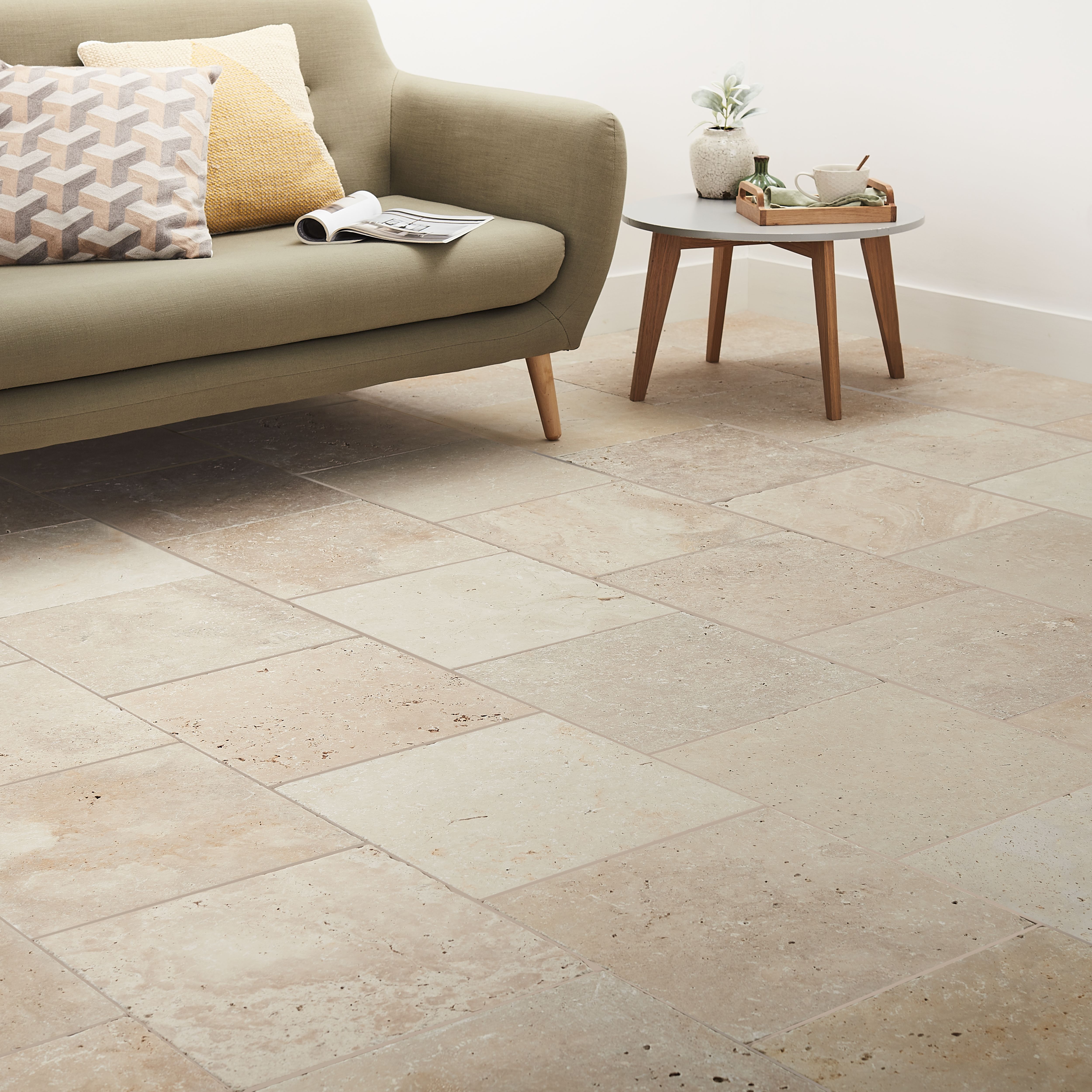 Real Tumbled Travertine Cream Matt Travertine Effect Natural Stone Wall Floor Tile Pack Of 4 L 406mm W 406mm Diy At B Q